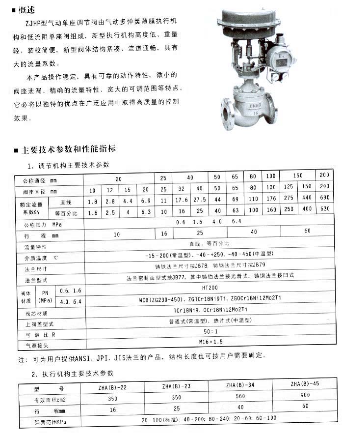 ZJHP型氣動單座調(diào)節(jié)閥由氣動多彈簧薄膜執(zhí)行機構(gòu)和低流阻單座閥組成。新型執(zhí)行機構(gòu)高度低、重量輕、裝校簡便,新型閥體結(jié)構(gòu)緊湊、流道通暢,具有大的流量系數(shù)。